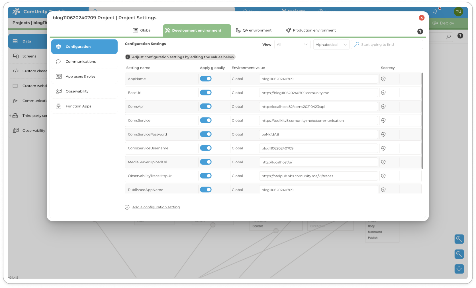 Configuration serves as a centralised configuration management system within the ComUnity Platform, designed to streamline the management of settings across different deployment environments—Development, QA/Testing, and Production. Its primary function is to provide an overview and control mechanism for the settings within each project's environment, enhancing consistency and simplifying the management process.