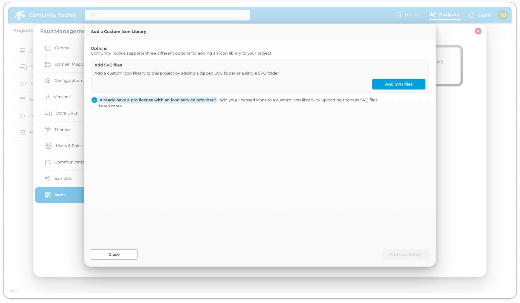 To add a icon/icon library to an existing project in the Toolkit, follow these steps: