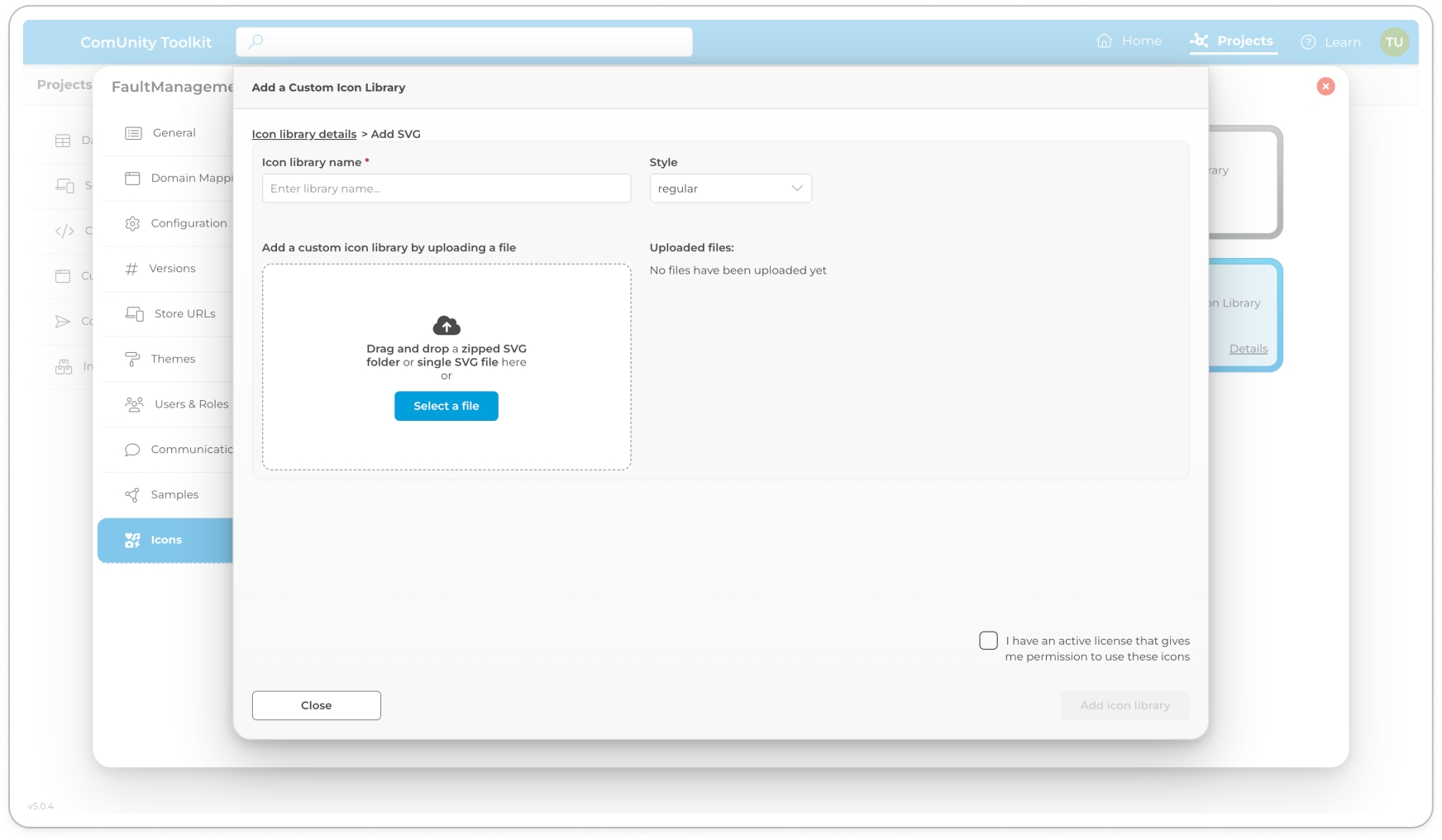 Enrich the visual vocabulary of your applications by adding custom icons to the Toolkit. This section details the process for uploading and managing your custom icons within the Toolkit, ensuring they are optimised for performance and scalability.