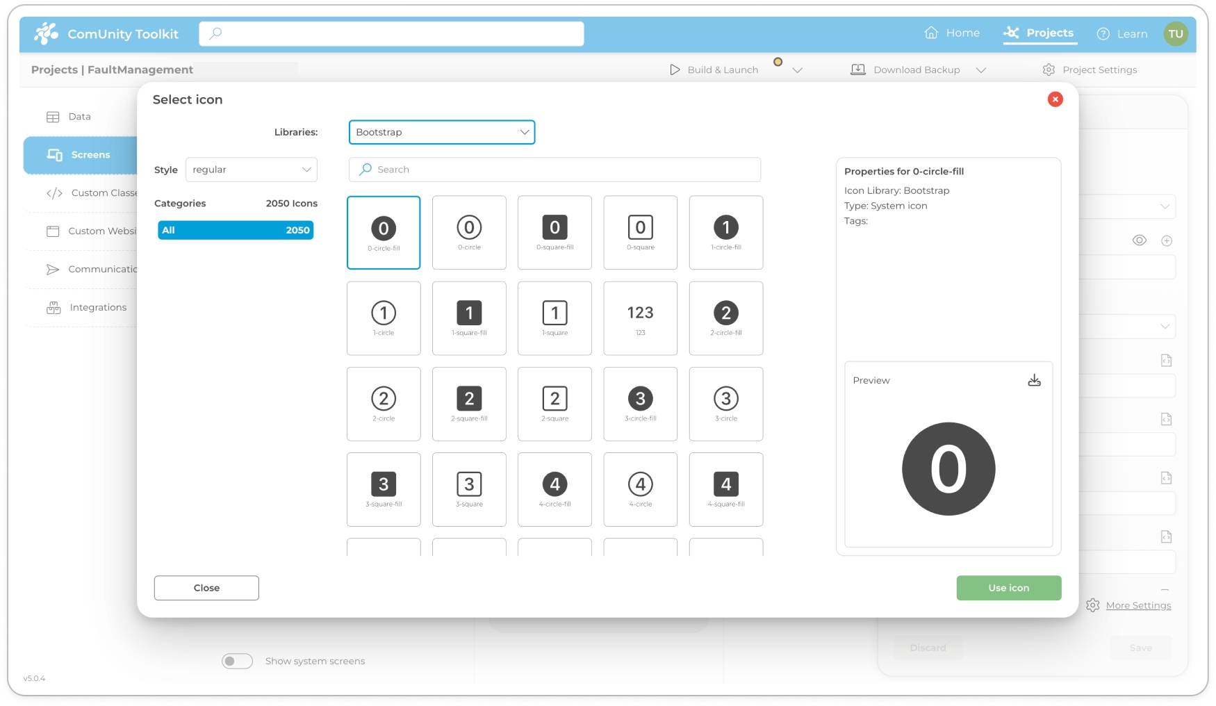 Choose the desired icon library. The Toolkit selects Bootstrap icons by default, if Bootstrap does not align with your requirements, explore alternative libraries provided within the Toolkit.