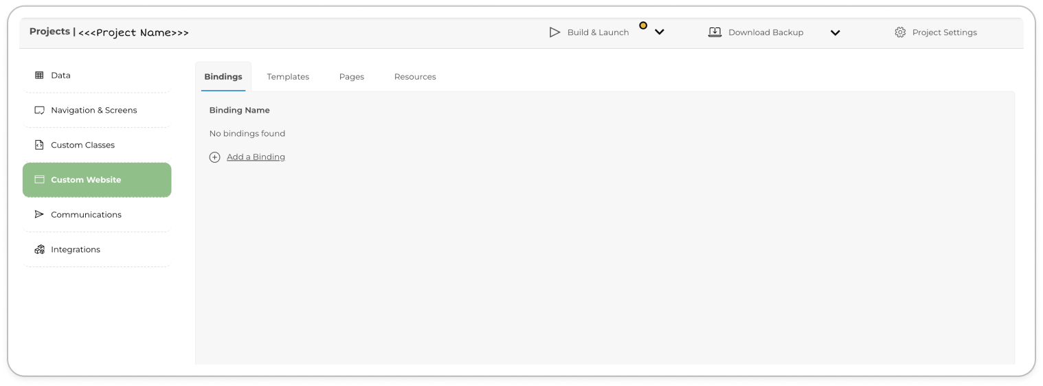 1. Open your project in the Toolkit and navigate to Custom Website then select the **Bindings** tab.<br>