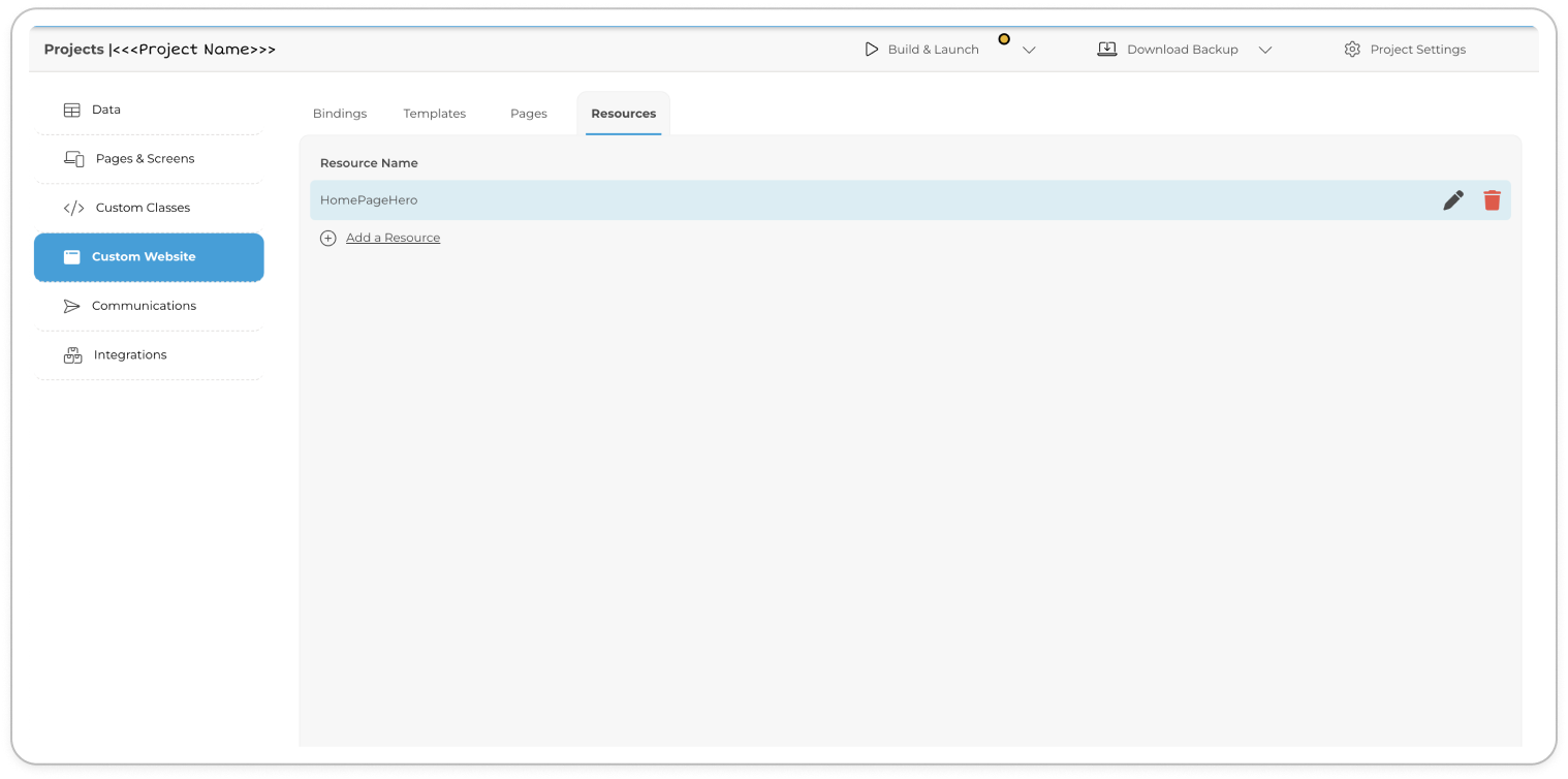 Open your project in the Toolkit and navigate to Custom Website then select the Resources tab to view a comprehensive list of all existing resources within your Custom Website.