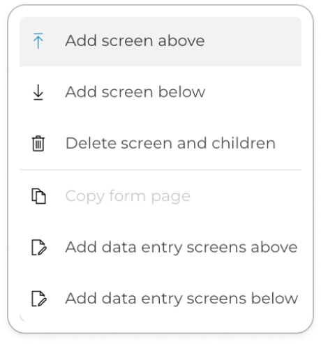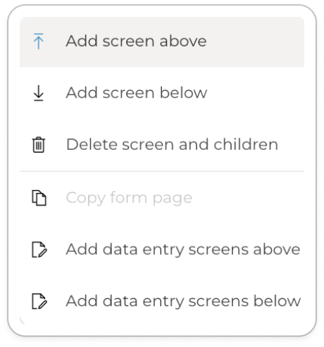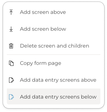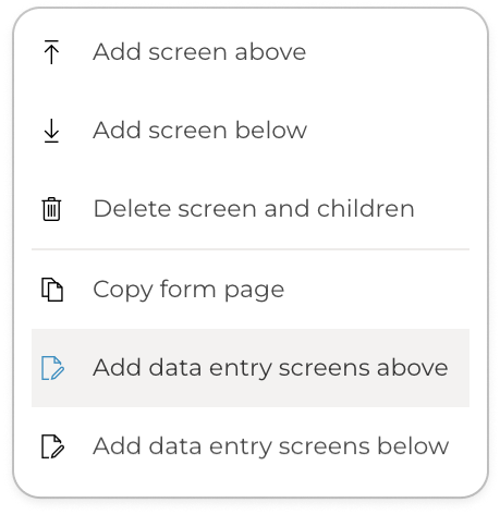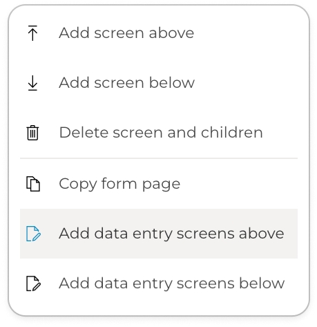 Select one of the following relevant options: Add data entry screens above or Add data entry screens below. This will prompt the Add data entry screens modal to appear (screenshot below).