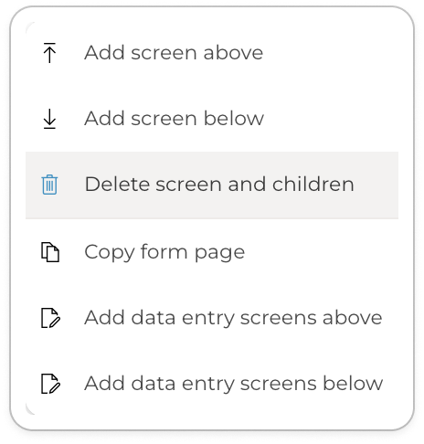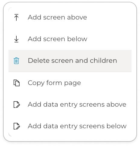 Delete screen modal Finally, click the Delete button in the modal to confirm the deletion of the child screen and its descendants.