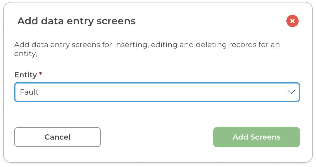 Finally, click the Add Screens button. This action will seamlessly integrate your Data Entry Screens for the chosen entity.