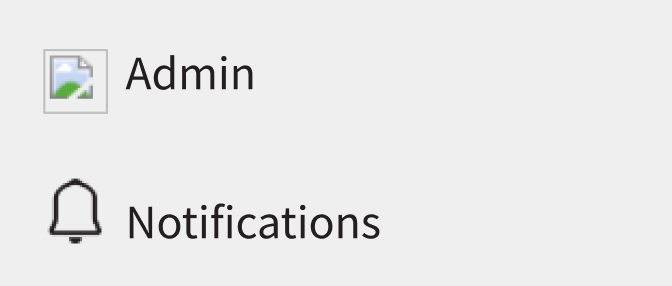 The screenshot below shows two menu items displayed as part of the Main Menu on a web application built using the ComUnity Development Toolkit. During navigation configuration the Icon for the Admin link was not selected during development, so it is displayed as a broken image before the link name, whereas for the Notifications menu item, a bell icon was selected.