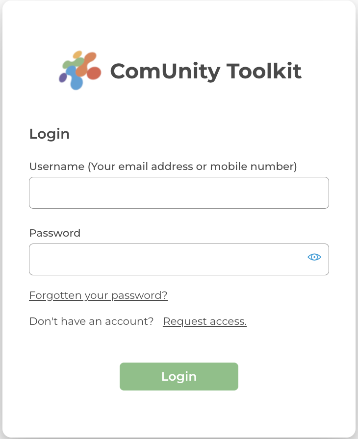 If you are a registered ComUnity user and have received approval for your registration request, you may log into the Toolkit using your access credentials. Once you have successfully logged in, you will be redirected to the Home Screen.