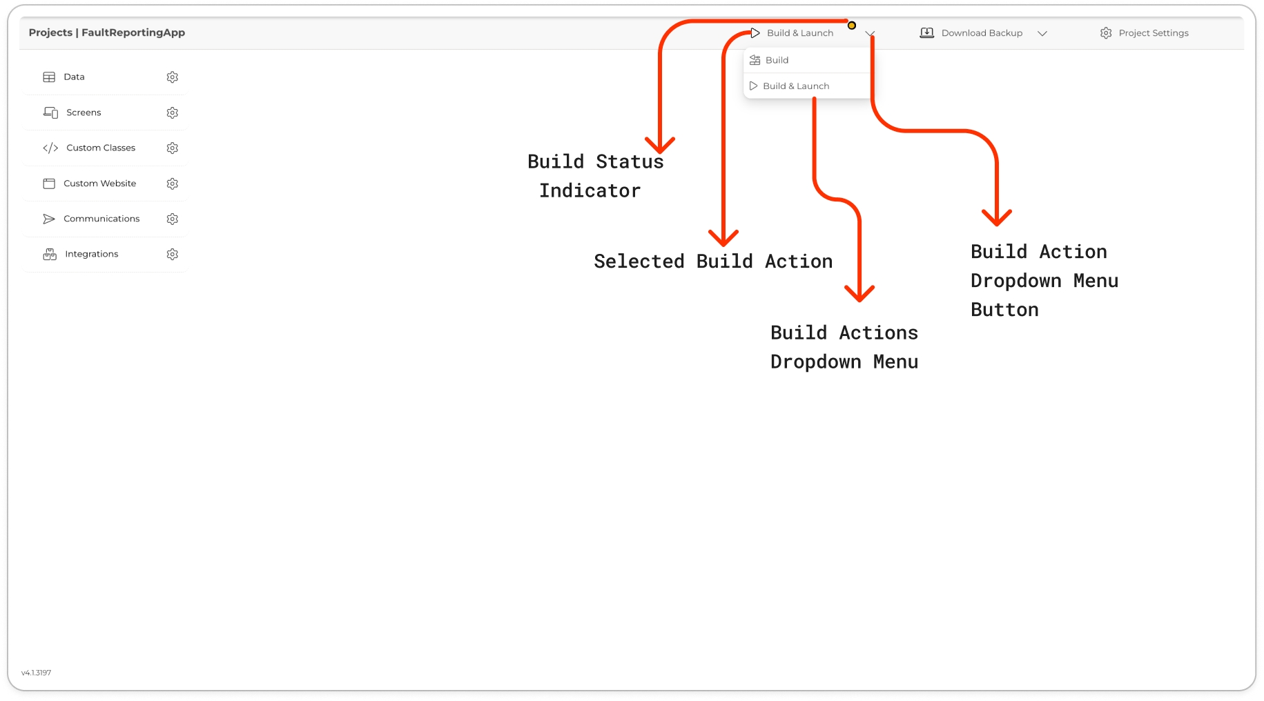 Build Action Dropdown Menu Button: Clicking on the Build Action Dropdown Menu Button reveals a menu that displays the supported Build Actions. This button allows you to toggle the visibility of the dropdown menu for easy access to these actions.