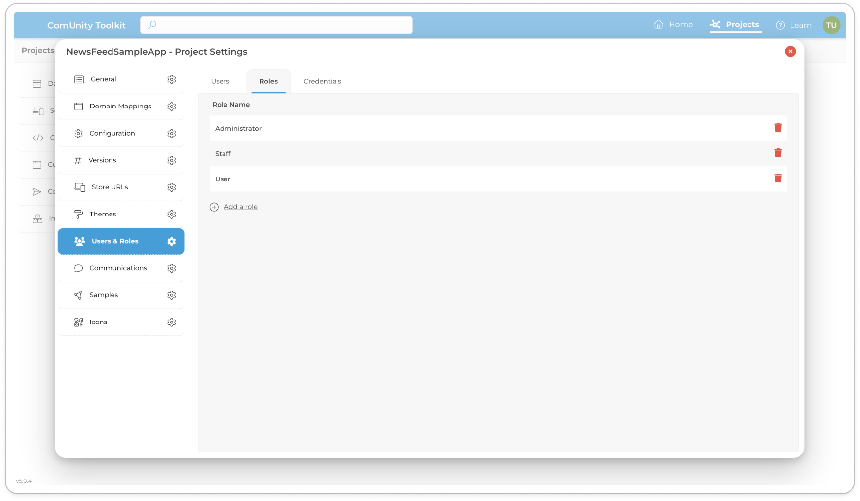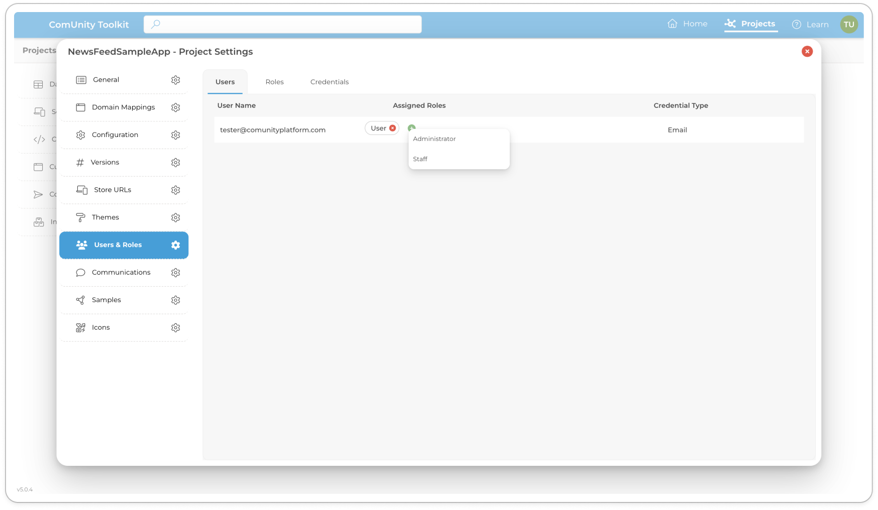 In the ComUnity Toolkit, you have full control over managing user roles to precisely define access and permissions for different users within your project. By default, the Toolkit provides three pre-defined roles: Administrator, Staff, and User.