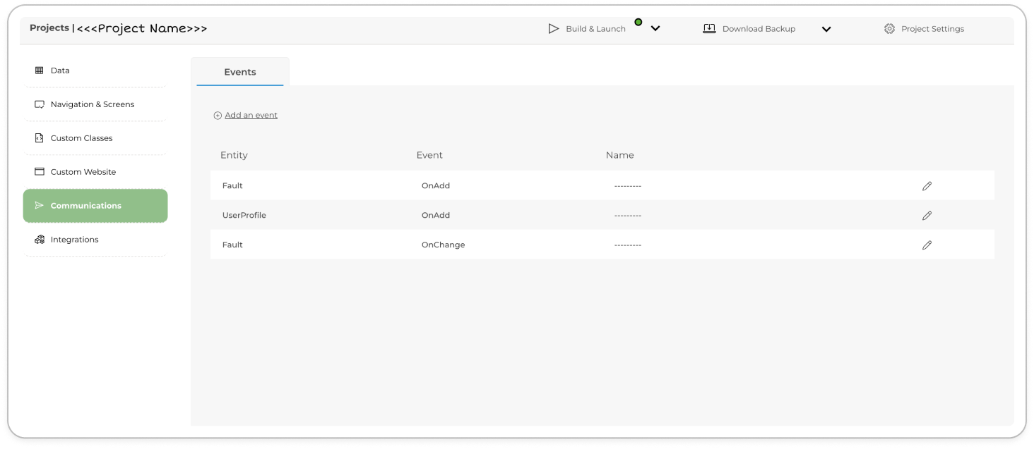 Open your project in the Toolkit and navigate to the Communications section. Here, you will find a list of all existing events in your project.