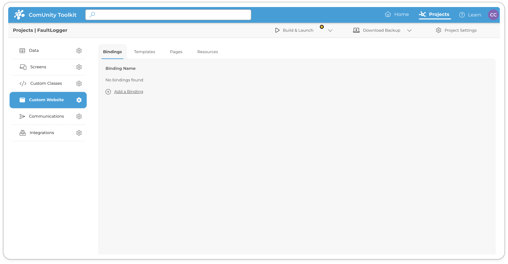 Bindings: Bindings enable you to configure domain mappings, establishing connections between A binding represents a specific domain associated with your custom website. With the ComUnity Developer Toolkit, you can configure multiple bindings to direct to a single custom website.